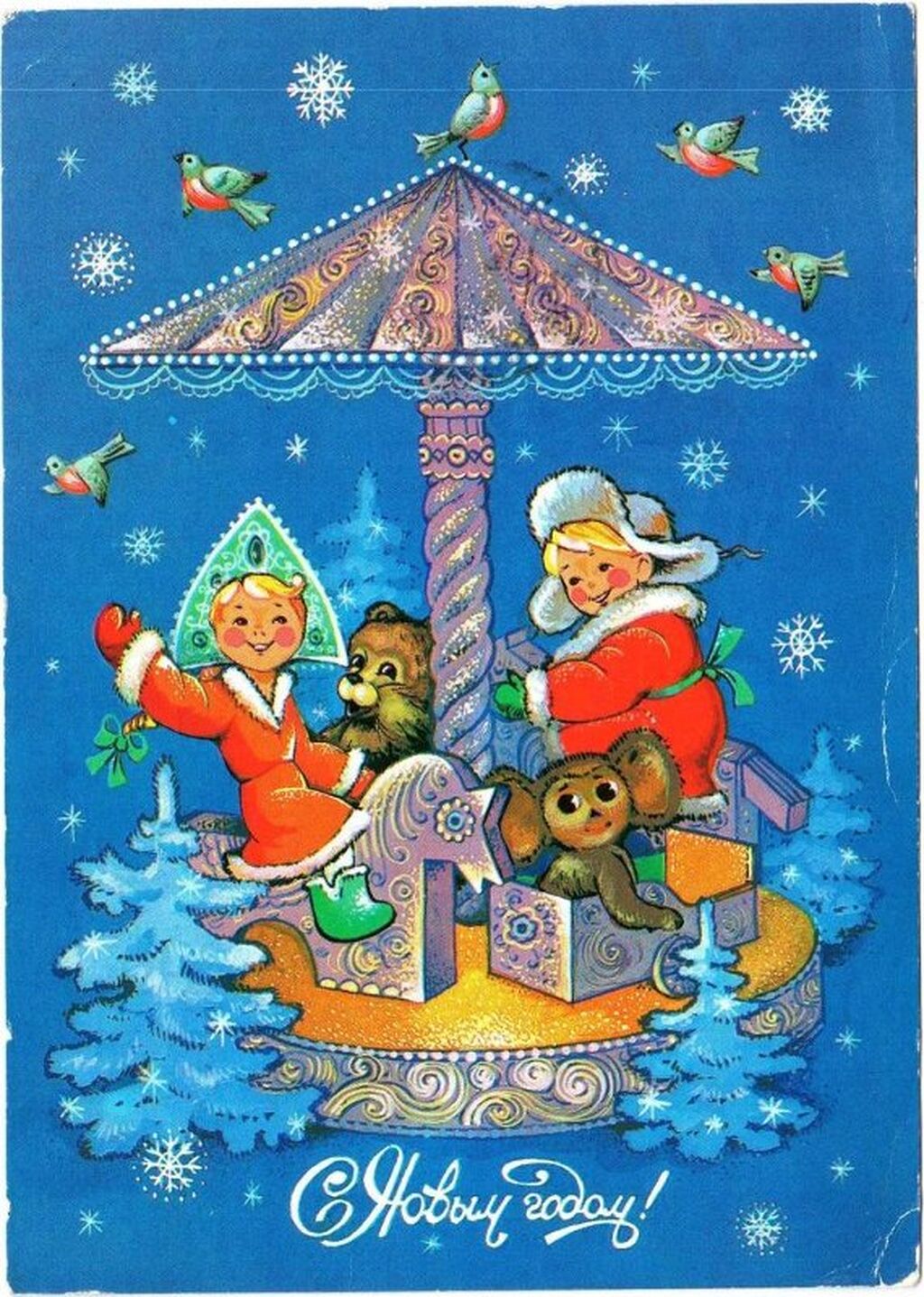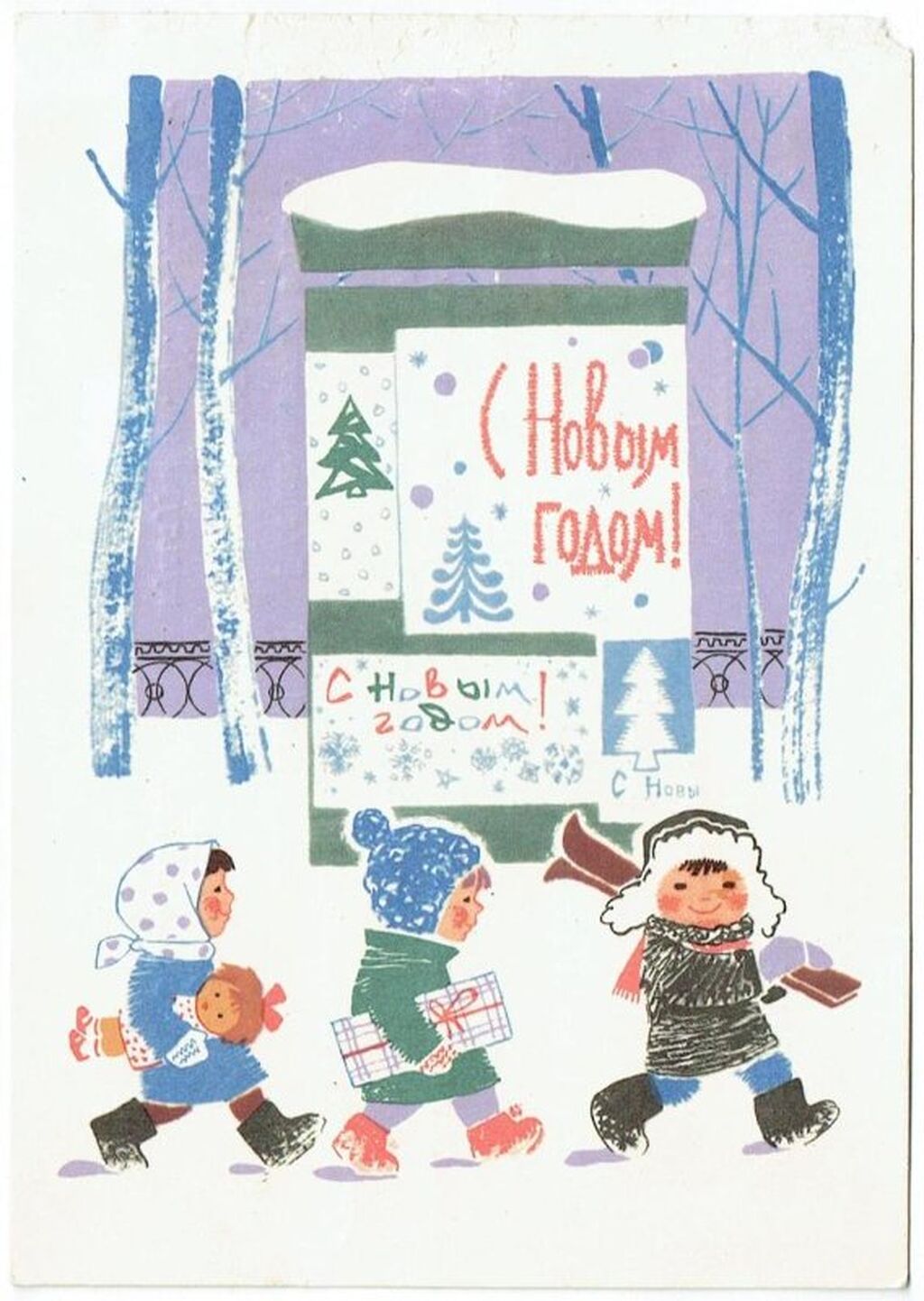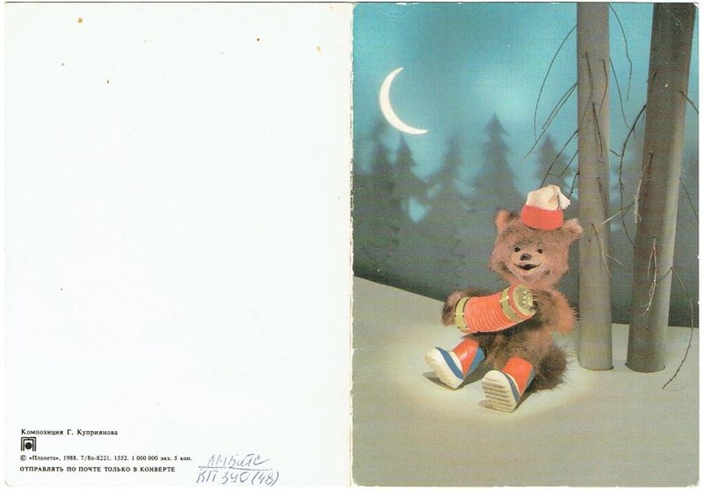 - 1960-70-е годы: Расцвет советской открытки. Популярность приобрели сказочные персонажи, такие как Дед Мороз и Снегурочка. На открытках стали появляться космонавты и космическая тематика.