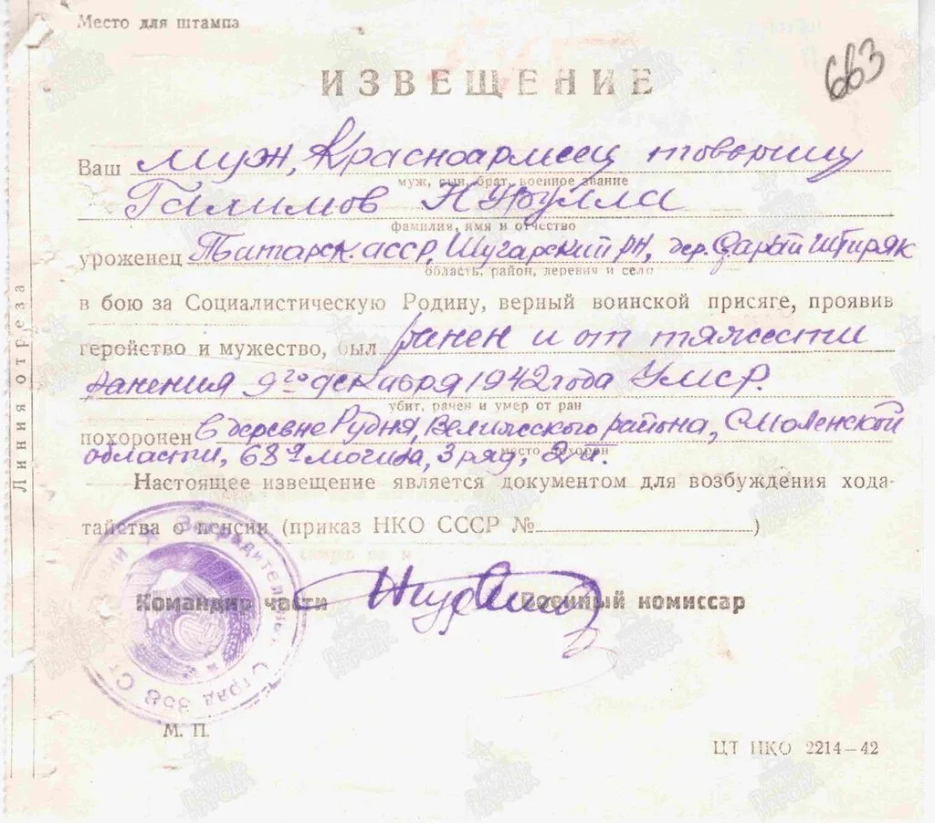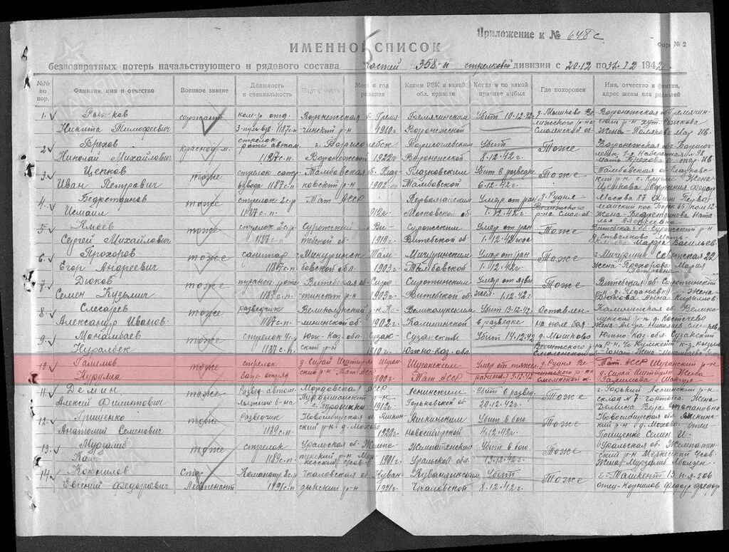Погиб от тяжелых ран 09.12.1942г. Место захоронения: Смоленская обл., Велижский р-н, д. Рудня, ряд 3, могила № 68, 2-й.